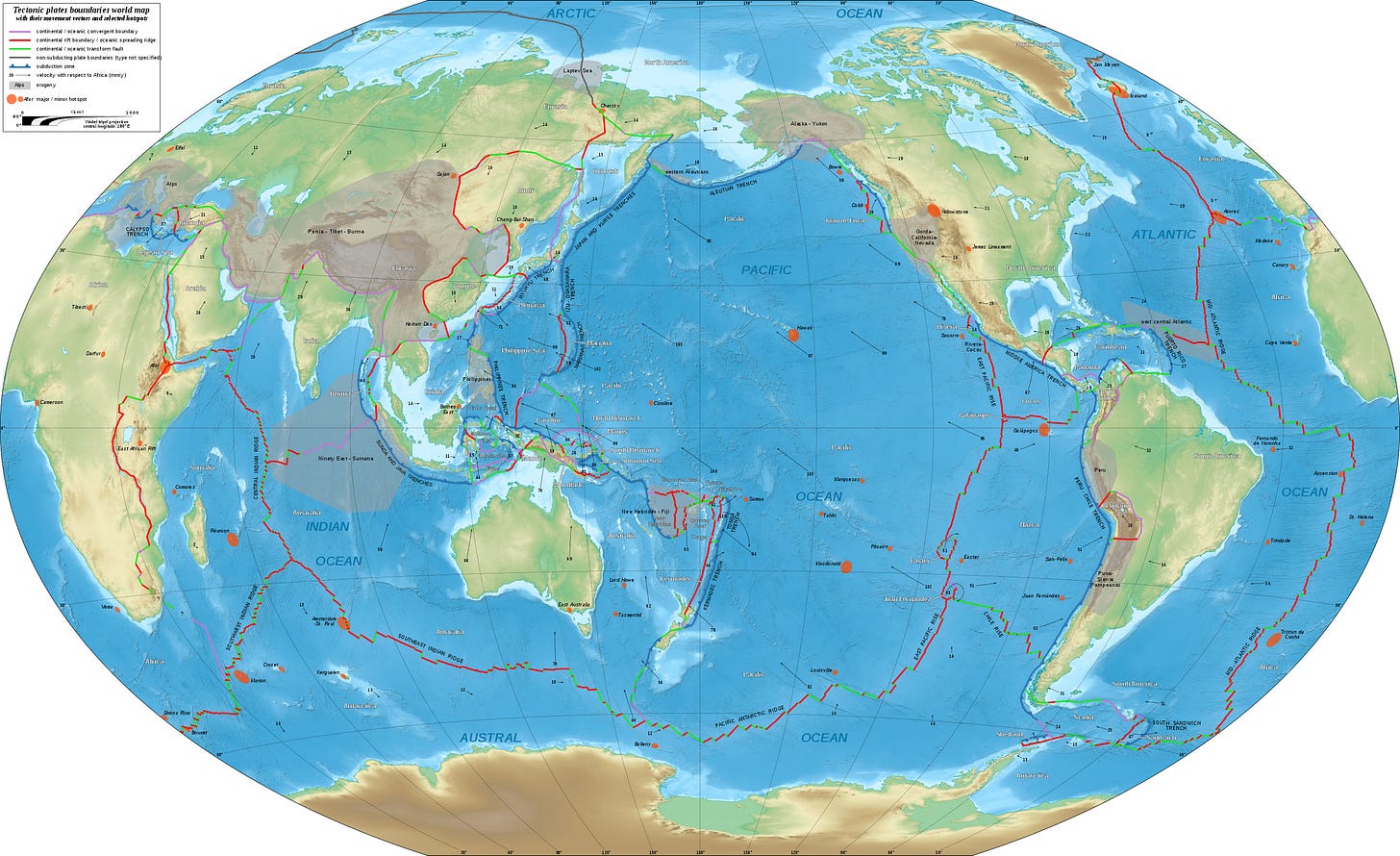 Plates move in 3 general directions: apart (divergent boundaries, a la rifts), into each other (convergent boundaries), and side-by-side like two pieces of sand paper rubbing against each other (transform boundaries). Out of those 3 general buckets come dozens of names for more specific interactions. Here are the fun ones: