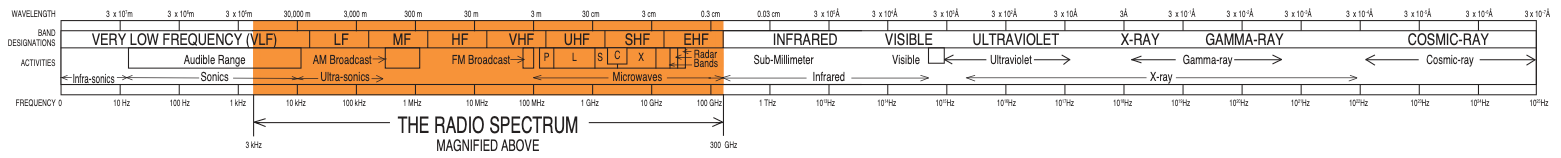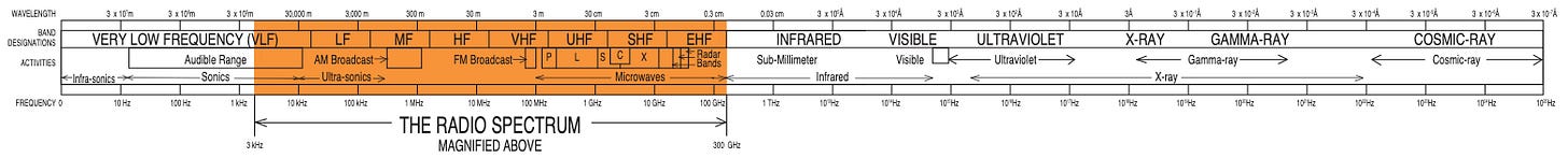 In my research into telescopes, I stumbled into the world of spectrum management. You may not realize it, but every wireless device you use is limited to a very specific frequency that it can communicate on, including your baby monitor and your kidsā play walkie-talkie. There is a finite spectrum of radio frequencies that exist in the world. Just like thereās a specific spectrum of visible light that humans can see. In fact, visible light and radio are really part of the same spectrum of waves that exist in our world, from supersonic to radio to infra-red to x-ray and beyond (see diagram of spectrum below). We use the radio spectrum for most of our wireless communications, including TV broadcasts, mobile phones, walkie-talkies, GPS, and satellite services.