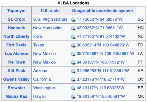 VLBA: Very Long Baseline Array // Size: 8,600 meters, 10 dishes // Location: 10 US sites: VLBA is an array of 10 dishes located very, very far apart. It was built in the late 80ās / early 90ās in sites across the US in order to achieve the longest baseline in very long baseline interferometry (no, I canāt explain what that is. Look it up).
