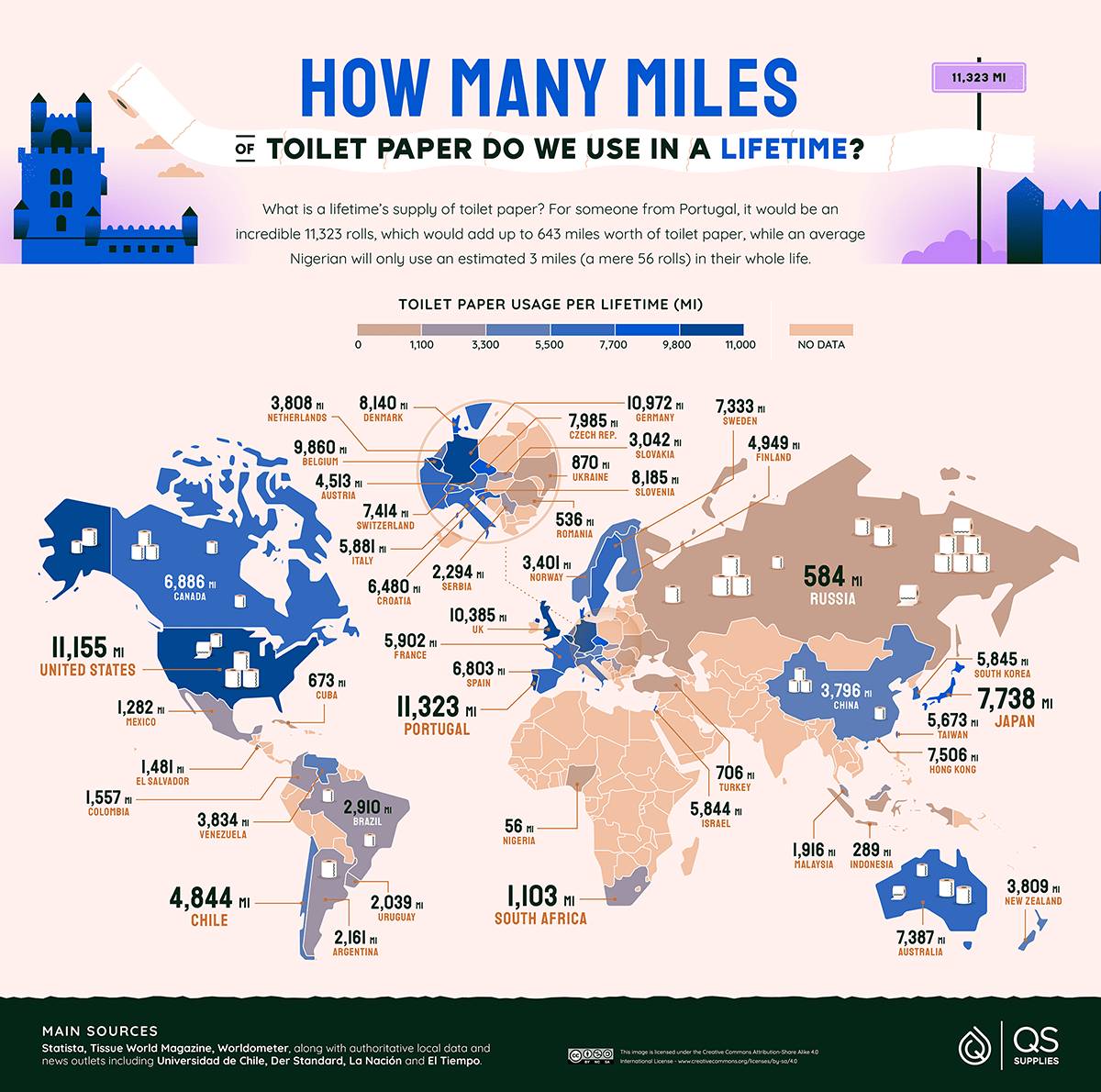 How Many Miles of Toilet Paper Do We Use In a Lifetime?: I saw this posted by the great map nerd Simon Kuestenmacher (@simongerman600 on Threads or Twitter). Itās a promotion by a UK bathroom supply company who appears to have really done their homework: they cite several sources including Tissue World Magazine (obviously Iām subscribing). Thereās lots more fun toilet paper infographics on their site too!